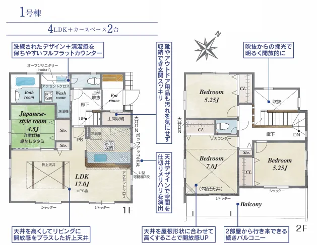 折上天井が広がりを演出する開放的なリビング♪家の中も玄関まわりも整う全居室収納と土間収納のある住まい◎生活に必要な施設が徒歩圏内にそろう快適な住環境!【1号棟】
