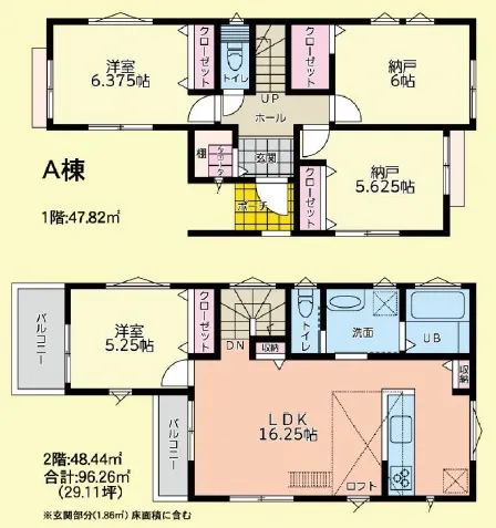 LDKは18.6帖、家族が集まる広々空間です。寒い季節に嬉しい床暖房付き!玄関ホールは吹抜けで開放感◎並列駐車2台可(車種による)☆