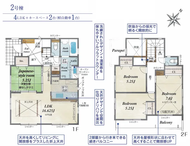 折上天井が開放的なリビングと、続き間の和室で広がる住空間◎2部屋から行き来できる続きバルコニー♪暮らしを支える生活施設が徒歩圏内にそろう立地!【2号棟】