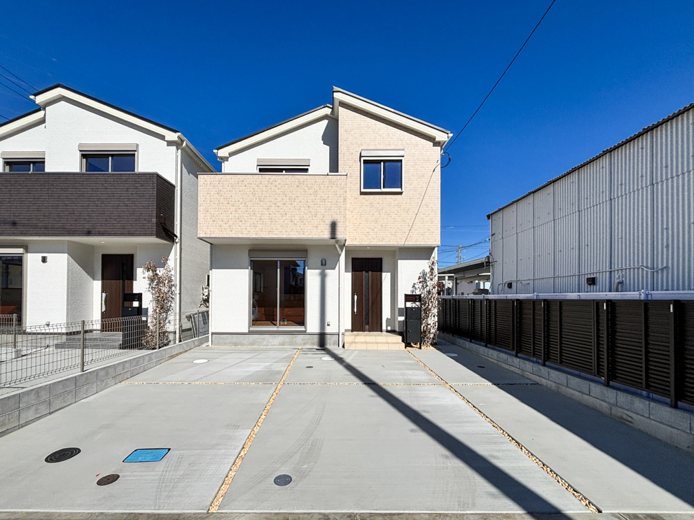 全棟敷地はゆとりの45坪以上 陽当たり良好です! 車2台並列駐車可能!自転車、バイクスペースもあります! 広々玄関土間、吹き抜けもあり室内開放的です。 これからの寒い時期にあると嬉しいリビング床暖房も全棟完備♪<1号棟>