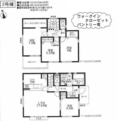 リビング横に続き間の4.5帖あり!来客用やお子様のお勉強やリモートワーク用にもお使いいただけます♪2階のお部屋は全て6帖以上!WIC、パントリー付き<2号棟>