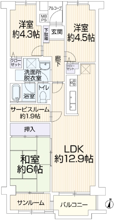 海近くの大規模マンション!小中学校や買い物施設が近く便利な住環境♪収納や書斎に便利なサービスルーム&南向きのサンルーム・バルコニー付☆