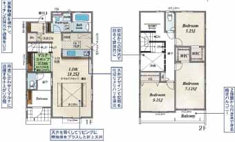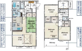 WIC3カ所完備の収納力豊富な4LDK!リビング上部は折り上げ天井で解放感◎2部屋から行き来できる広々バルコニー♪【2号棟】