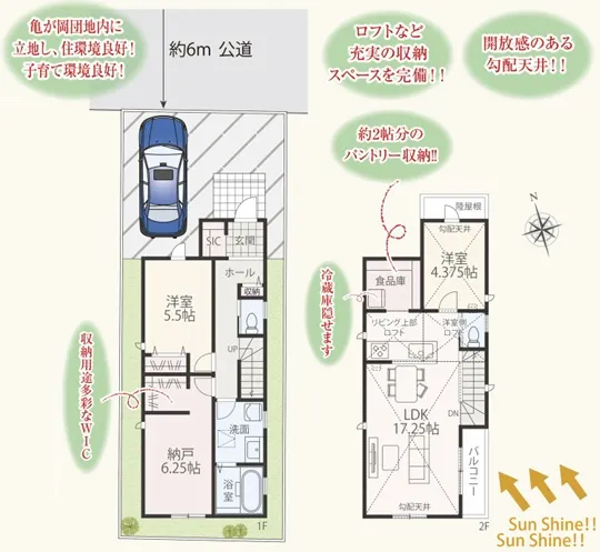 亀が岡団地内に立地し、子育て環境良好です!ロフト、パントリー、WIC、SICと収納多彩♪2階リビングは勾配天井で開放感をより演出☆