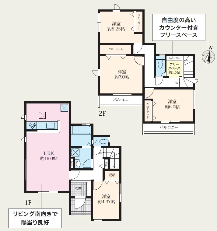 ◆全10棟の新築分譲地、モデル棟あり◆あると便利な2面バルコニー♪小さなお子様がいても目が届く対面キッチン!モデル棟完成済みで内覧可能です☆<5号棟>